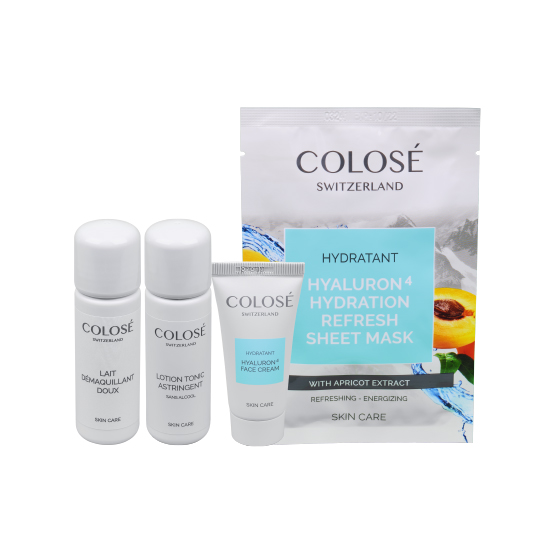 Reinigungsmilch (40 ml), Gesichtswasser (40 ml), Hyaluron-Creme (15 ml) und Hyaluron-Tuchmaske.